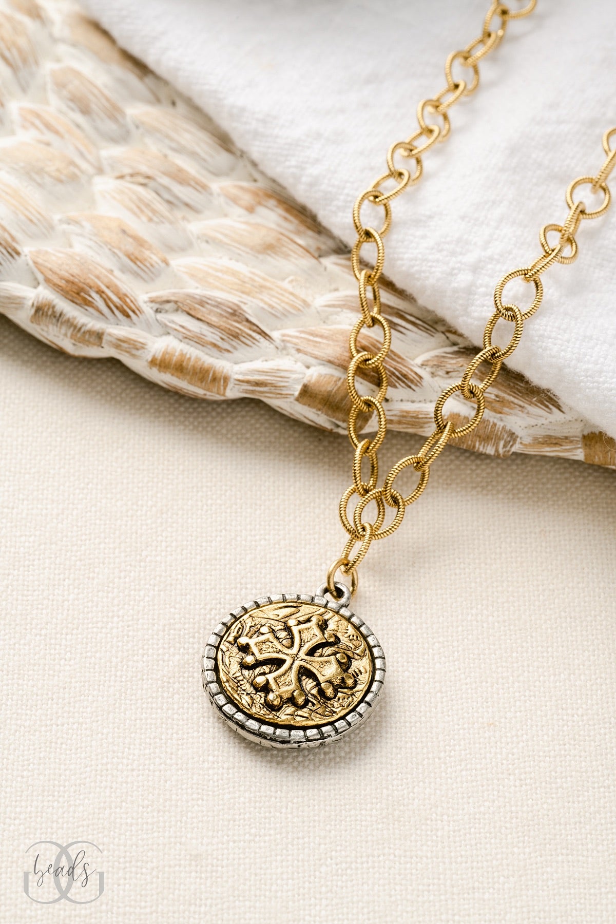 Add some unexpected charm to your jewelry collection with the Adelaide Necklace. This playful two tone coin necklace is sure to catch the eye and add a touch of whimsy to any outfit.