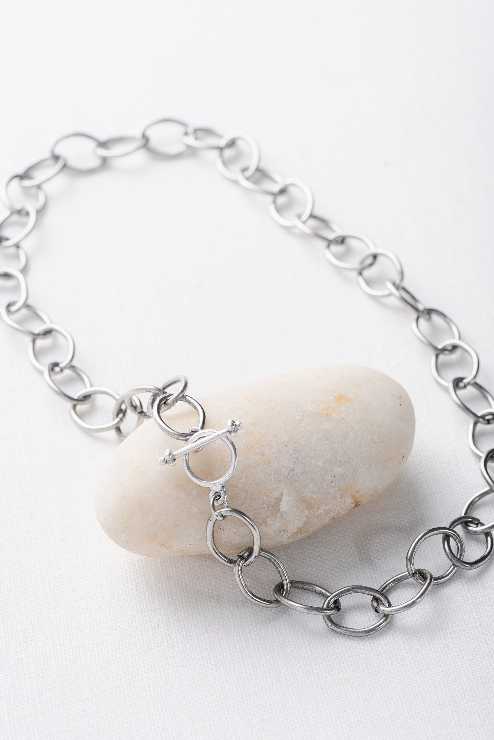 Indulge your style with the Argenti Necklace. This elegant and exclusive piece features a perfectly polished oval link design in simple silver. The sophisticated and tasteful design captures the essence of luxury and will elevate any outfit. Perfect for any occasion, the Argenti Necklace is a must-have for any fashion-forward individual.