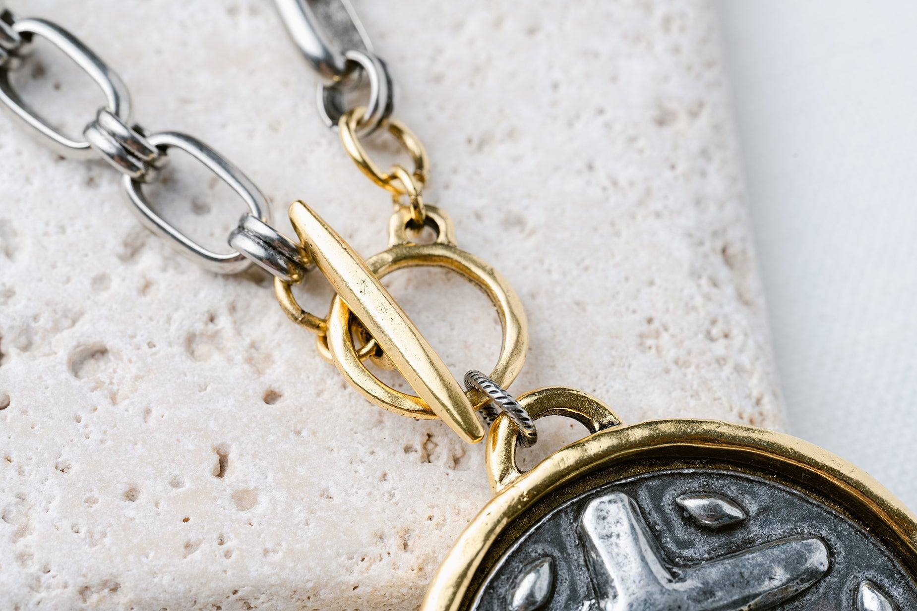 Shield yourself with the powerful Armor of God Necklace. This stunning necklace features a bold Cross Coin pendant, symbolizing faith and protection, on a mixed metal gold and silver chain. Wear it as a reminder of your strength and faith.