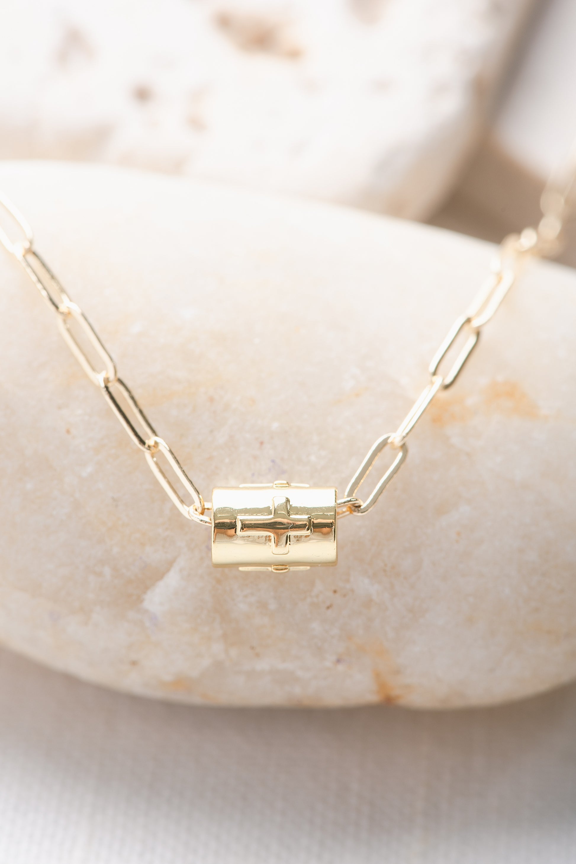 Embrace your faith and wear it every day with our At the Cross Necklace. This stylish gold filled paperclip necklace features a stunning cross barrel bead, making it the perfect everyday accessory. Show your devotion in a fashionable and subtle way with this unique and versatile piece.