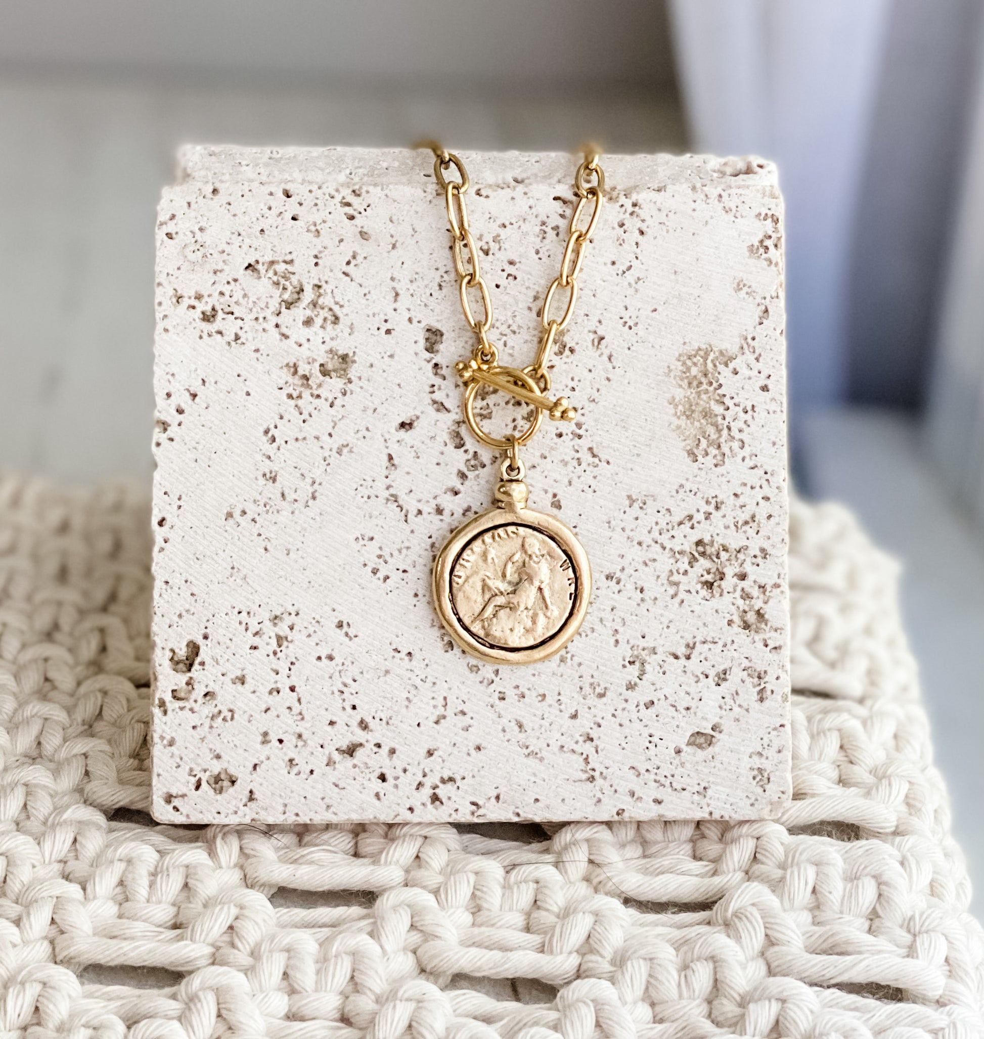 Our Caesar Necklace features artisan gold chain with front toggle closure and a gorgeous artisan Greek coin.