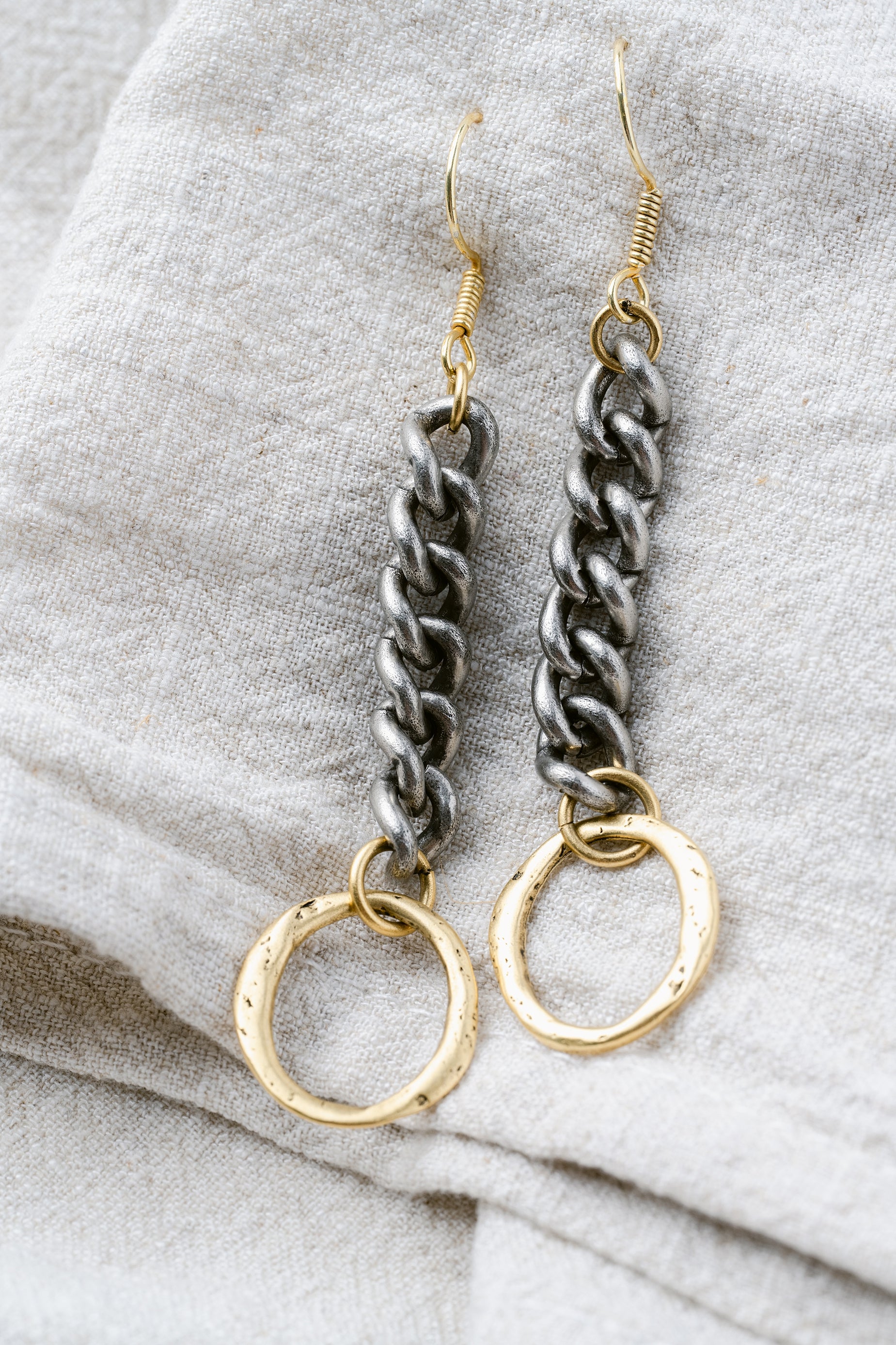 Elevate your style with the Chainbreaker Earrings, featuring a bold chunky silver chain design paired with a contrasting gold ring. These earrings offer a refined balance of edgy and elegant, perfect for making a standout statement in any sophisticated ensemble.