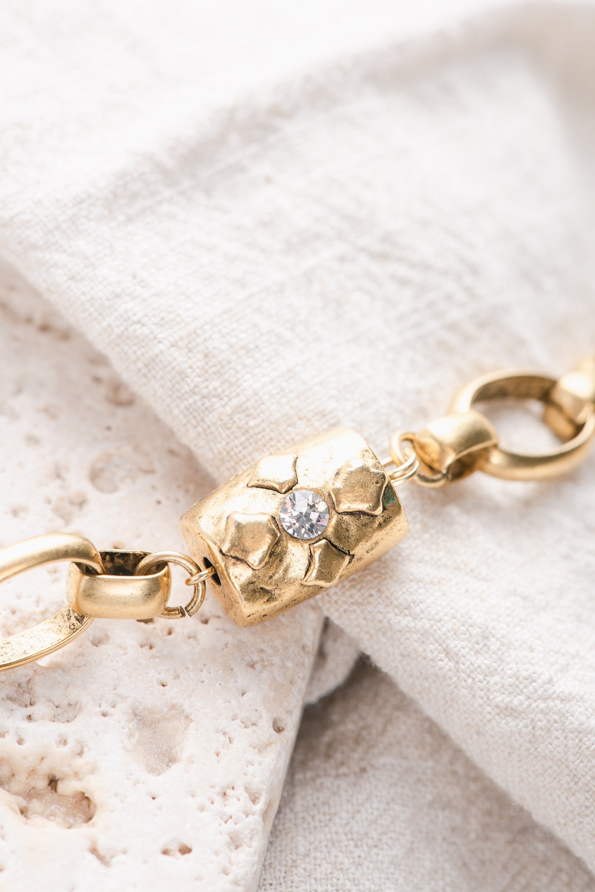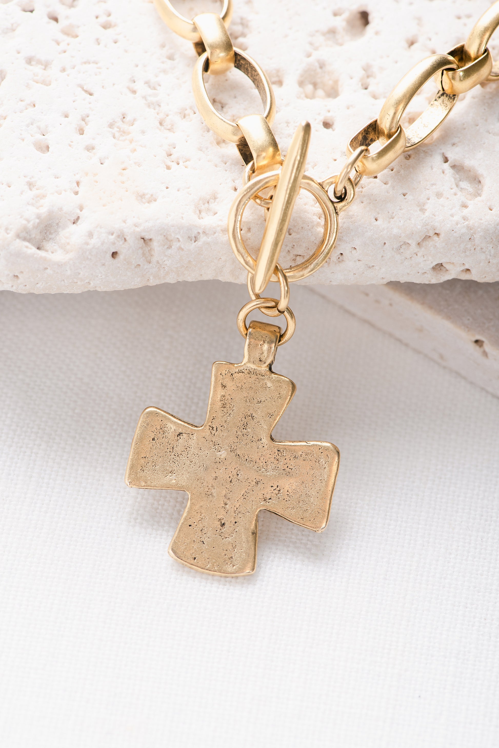 Transform any outfit into a work of art with the Deus Necklace. This bold chain necklace exudes luxury with its hammered cross and crystal bead accent. The toggle closure adds a touch of exclusivity to this sophisticated piece. Elevate your style and make a statement with the Deus Necklace.