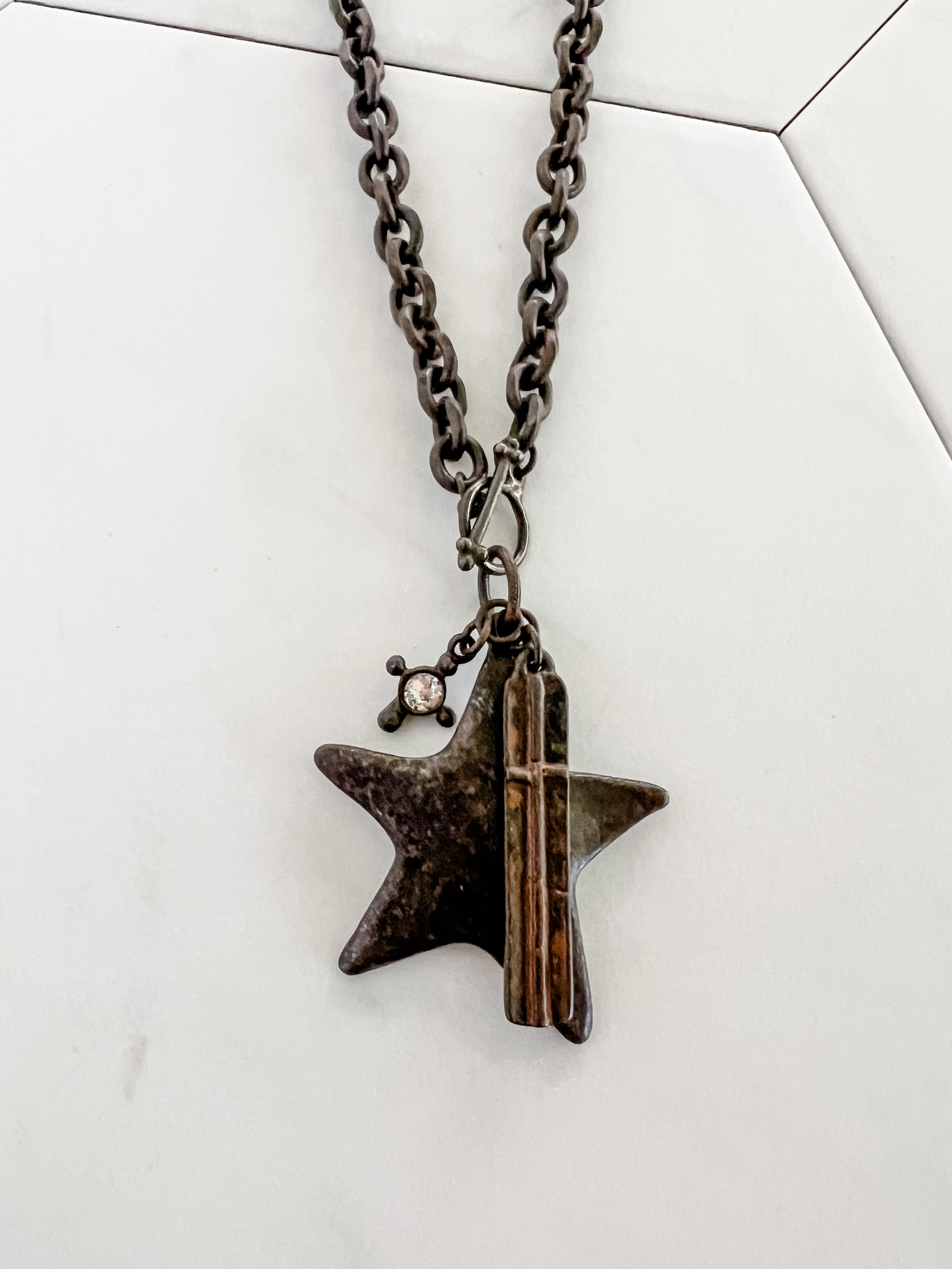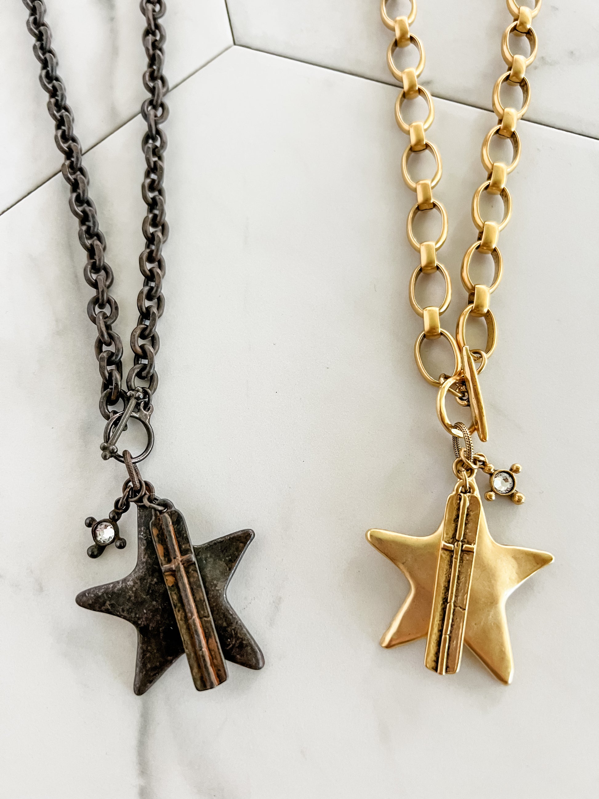 And on the Fourth Day, he created the stars. Our bold Fourth Day Necklaces feature chunky chain and a bold star and cross combination. Elevate any outfit with this beautiful necklace.