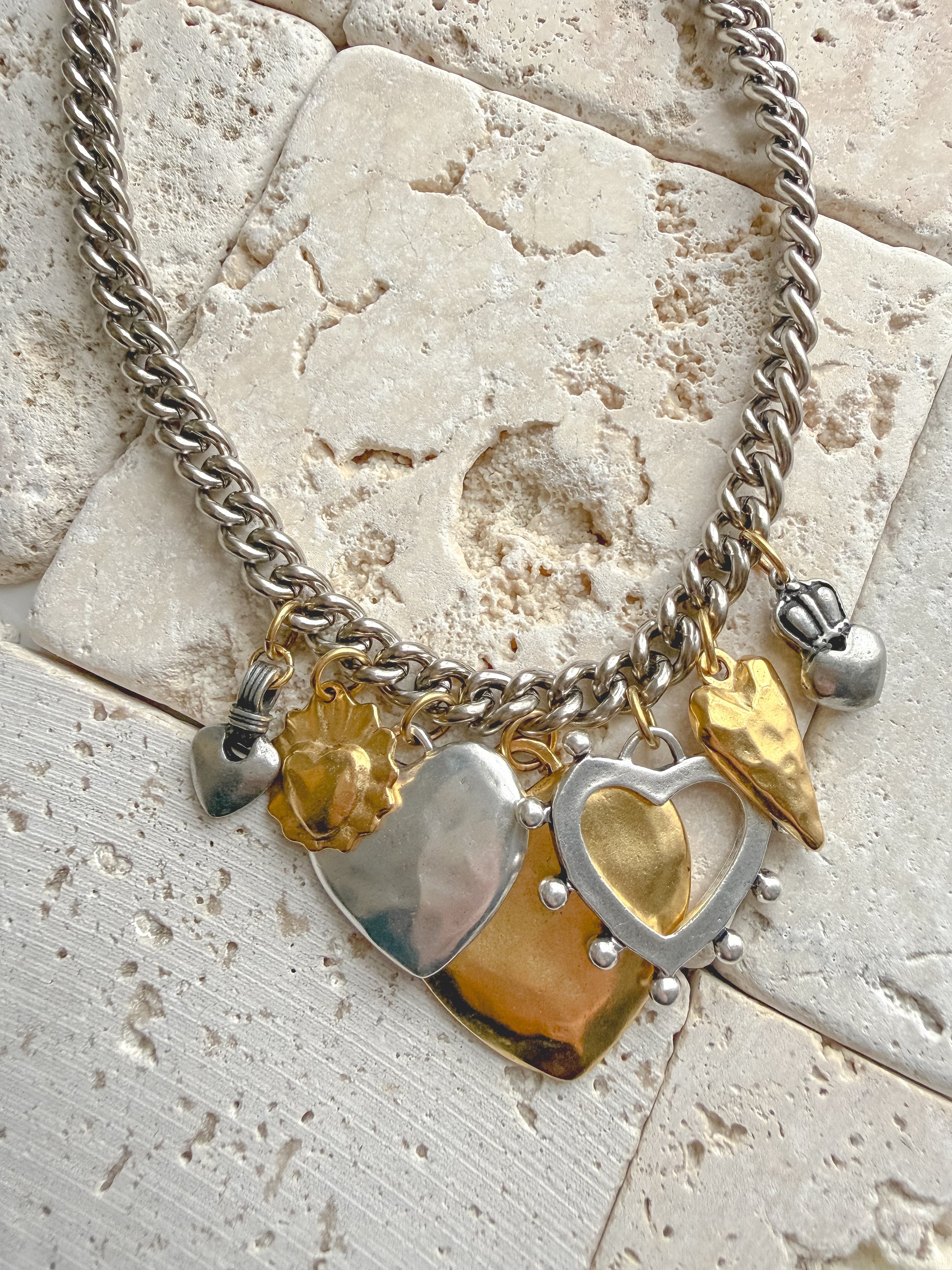 ✨ Chunky silver chain with mixed-metal heart charms