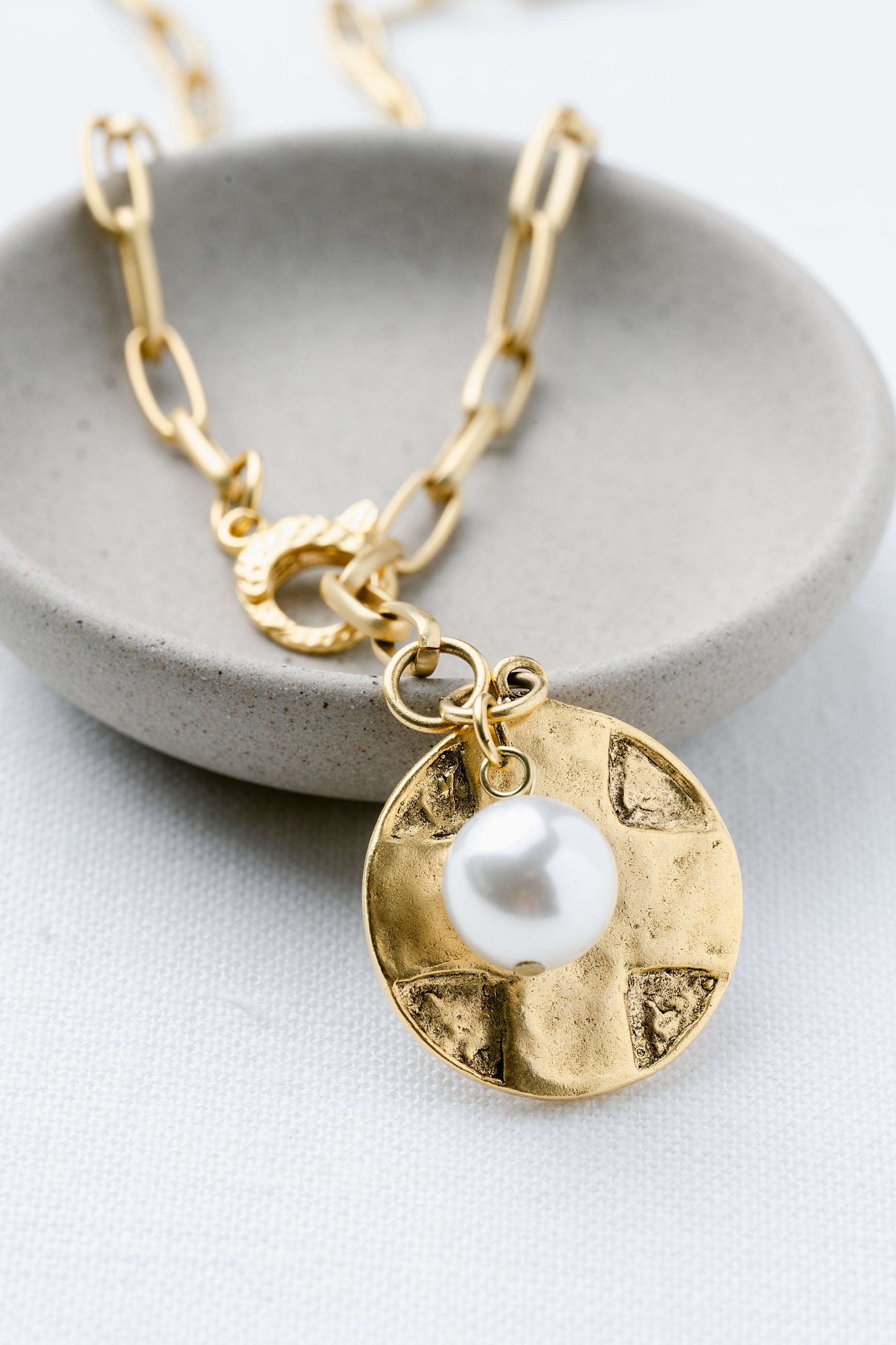 Carry faith and beauty close to your heart with The Psalm 23 Coin Necklace. This meaningful piece features a radiant gold coin pendant, detailed with a central luminous pearl set against a textured cross design. Inspired by the comforting promise of Psalm 23, this necklace serves as both a statement of style and a reminder of faith and protection.