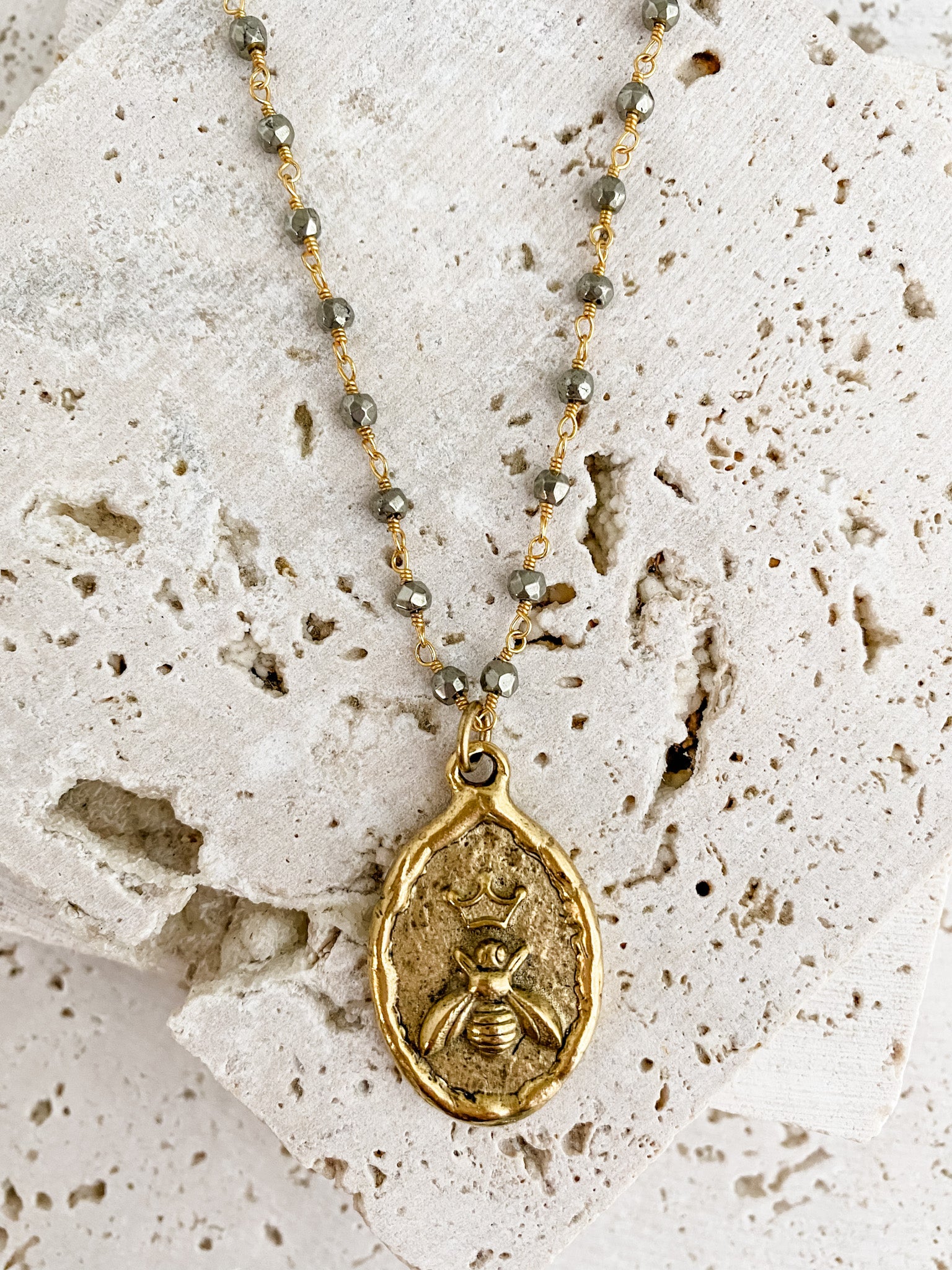 A fabulous addition to your jewelry collection, our Queen Bee Necklace pulls double duty. With a a Queen bee on one side and fleur de Lis on the other, it can be worn two ways.