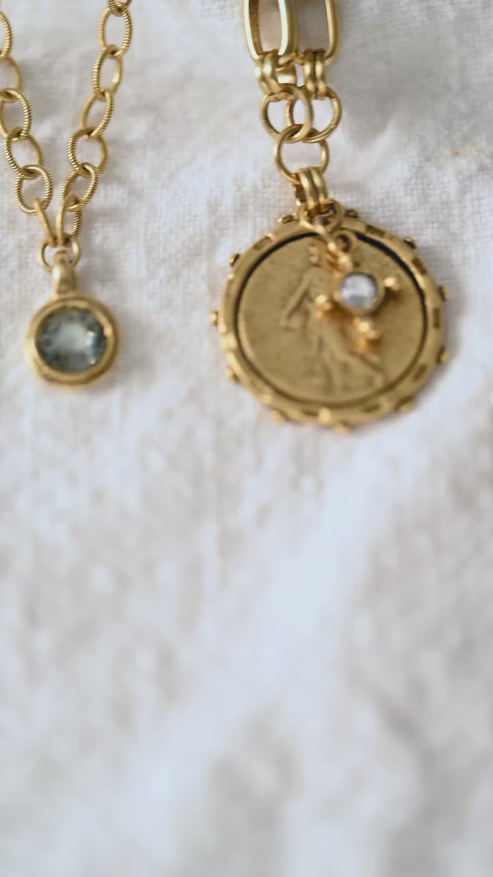 Embody the beauty of growth and abundance with our Sowing Seeds Necklace. Adorned with a bold Marienne the Sower coin and delicate crystal accent, this artisan gold chain necklace exudes elegance and exclusivity. A truly luxurious addition to your jewelry collection.