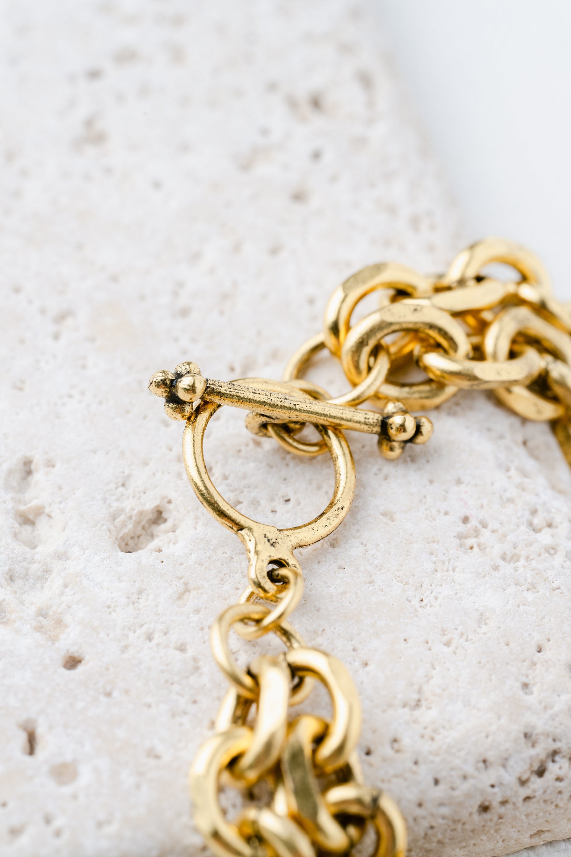 Every jewelry collection deserves a timeless staple, and The Essential Chain Bracelet is just that. With its bold, interwoven gold links and secure toggle clasp, this bracelet offers both strength and elegance in a single design. Its polished finish gives it a luxe edge, while the intricate chainwork adds texture and dimension that make it truly unforgettable.