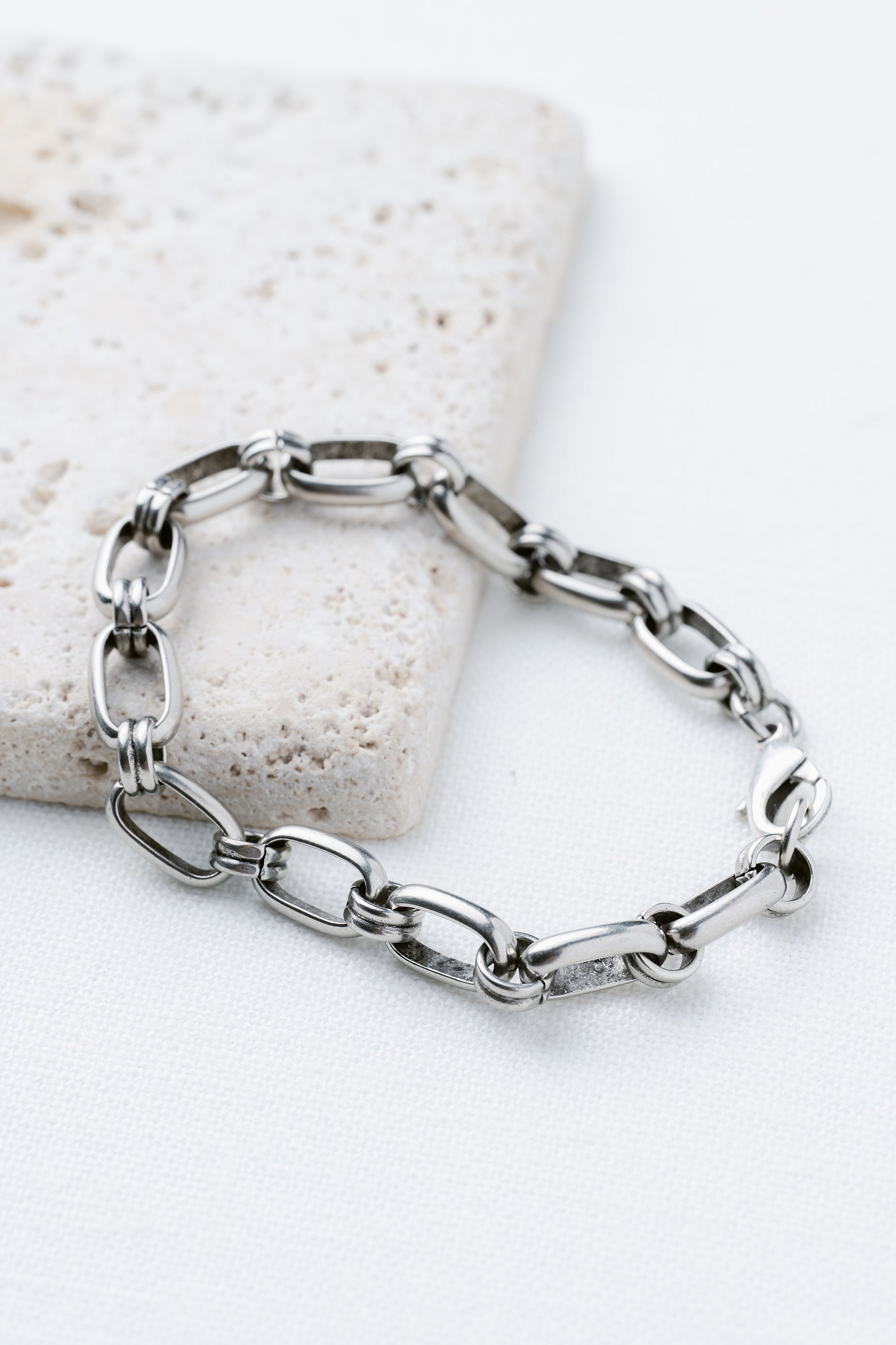 Strong, sleek, and undeniably modern—the Titan Chain Bracelet is designed for those who love bold minimalism. Crafted with polished silver links in a structured, industrial-inspired design, this bracelet strikes the perfect balance between power and style. Its weighty feel and clean lines make it a standout accessory that’s just as versatile for everyday wear as it is for elevated evenings.